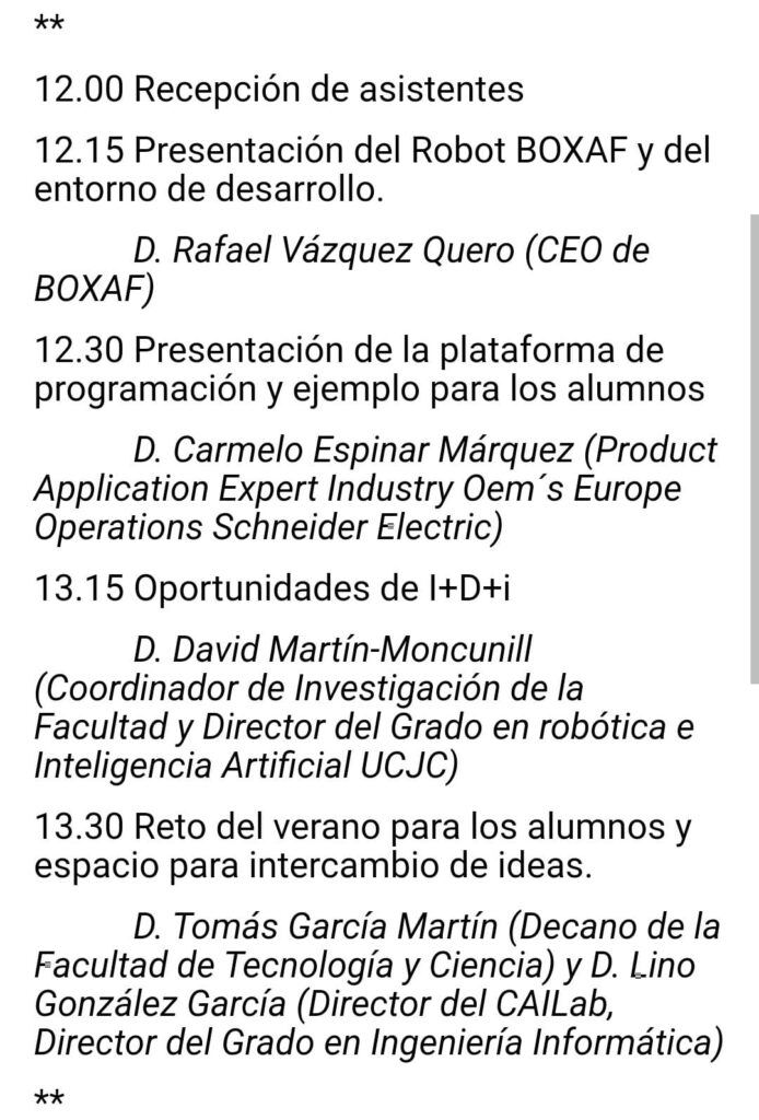 Ayer día 30 de Mayo 2024 nos dimos cita en la UCJC de Madrid representantes de las federaciones madrileñas de deportes de combate (Boxeo, Karate, Taekwondo, Luchas Olímpicas, Judo) y COEDPI en una propuesta del grado de Robótica + Inteligencia Artificial de dicha universidad, la multinacional de software y hardware Schneider, y la empresa BOXAF desarrolladora de un equipo pensado para nuestras disciplinas deportivas.