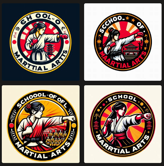 “Necesito un logotipo para una escuela de artes marciales redondo, donde en el interior haya una mujer dando un puñetazo vestida con un kimono y un cinturón negro. Detrás de la chica, dentro de la misma esfera, habrá una pagoda japonesa. Alrededor de la esfera del escudo debe aparecer el texto: “escuela de artes marciales”. Los colores en los que quiero que te bases serán el rojo y el amarillo”.