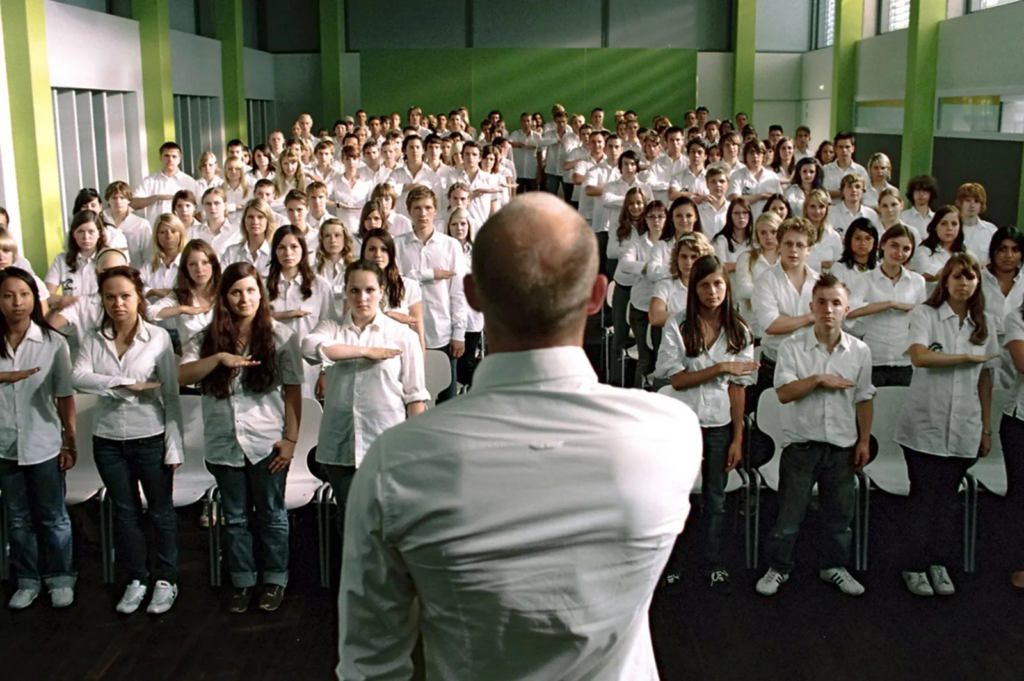 Tal y como se ve en la película “La Ola”, los estudiantes trabajan caminar en el sitio a la vez siguiendo el mismo ritmo hasta convertirse en “una unidad”, o realizan saludos alineados a los mandos jerárquicos en ese caso el profesorado lo que recuerda a las imágenes nazis de los soldados saludando en columnas.