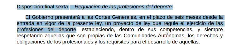 Este mandato emana de la última reforma de la ley del deporte del 30 de Diciembre 2022, en su disposición final sexta, en la cual se daba un plazo de 6 meses al gobierno para comenzar a preparar un proyecto de ley que regulara las profesiones de la docencia deportiva.