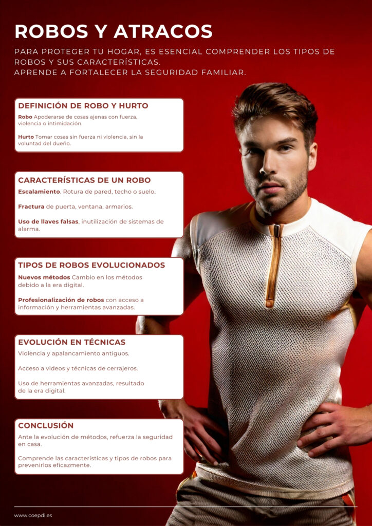 Para proteger tu hogar, es esencial comprender los tipos de robos y sus características. Robo: Apoderarse de cosas ajenas con fuerza, violencia o intimidación. Hurto:Tomar cosas sin fuerza ni violencia, sin la voluntad del dueño.