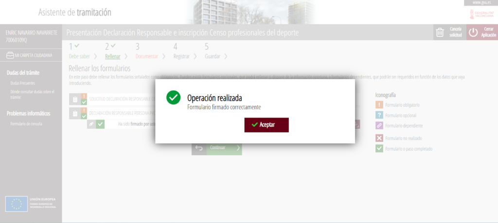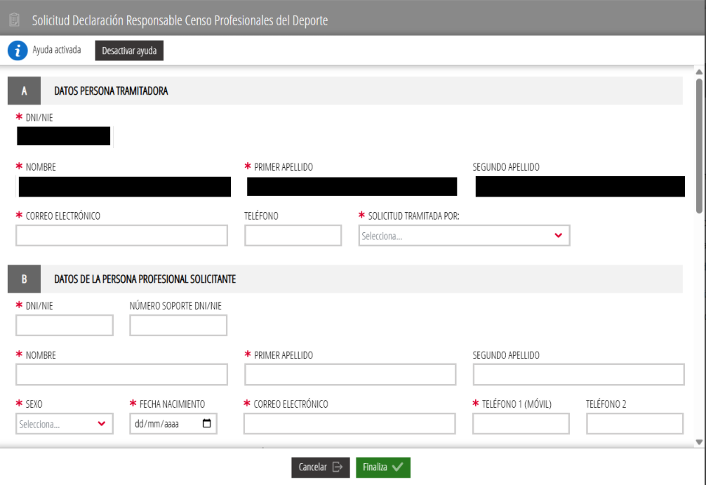 Una vez pulsado el botón finalizar, se accede al formulario con la «DECLARACIÓN RESPONSABLE»