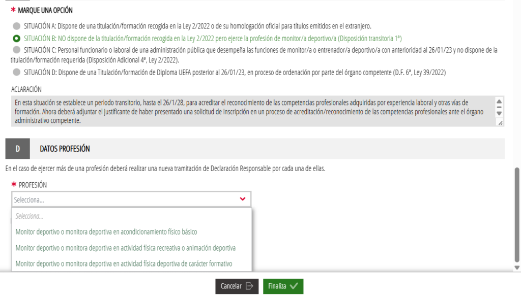 OPCIÓN A: aquellos que tengan un certificado de profesionalidad vía SEPE, una formación profesional de grado medio o superior, una carrera universitaria, o una titulación federativa de técnico deportivo o técnico deportivo superior deben pulsar la opción A.