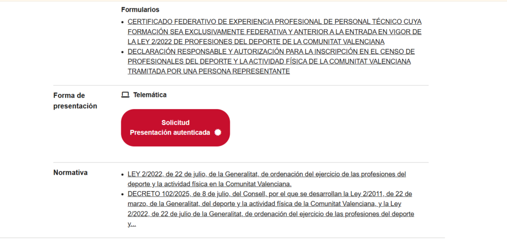 4. Si tenéis un certificado federativo de experiencia profesional con un título anterior a la publicación de le ley (julio 2022), debéis rellenar el formulario. Para el resto de casos, hay que pulsar el botón rojo de presentación telemática.