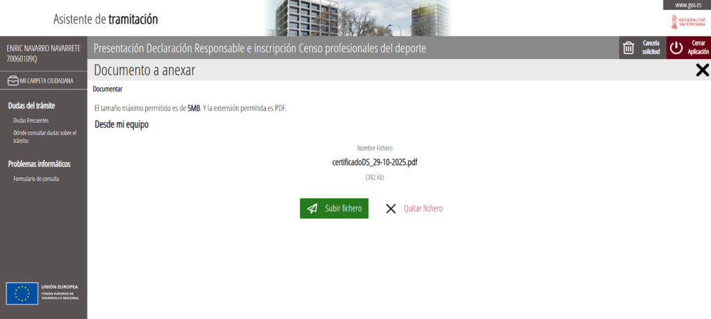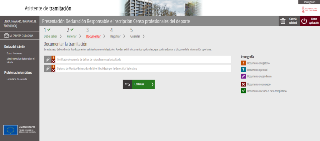 Adjuntamos nuestros títulos, certificados, o declaración responsable, etc y pulsamos en continuar: